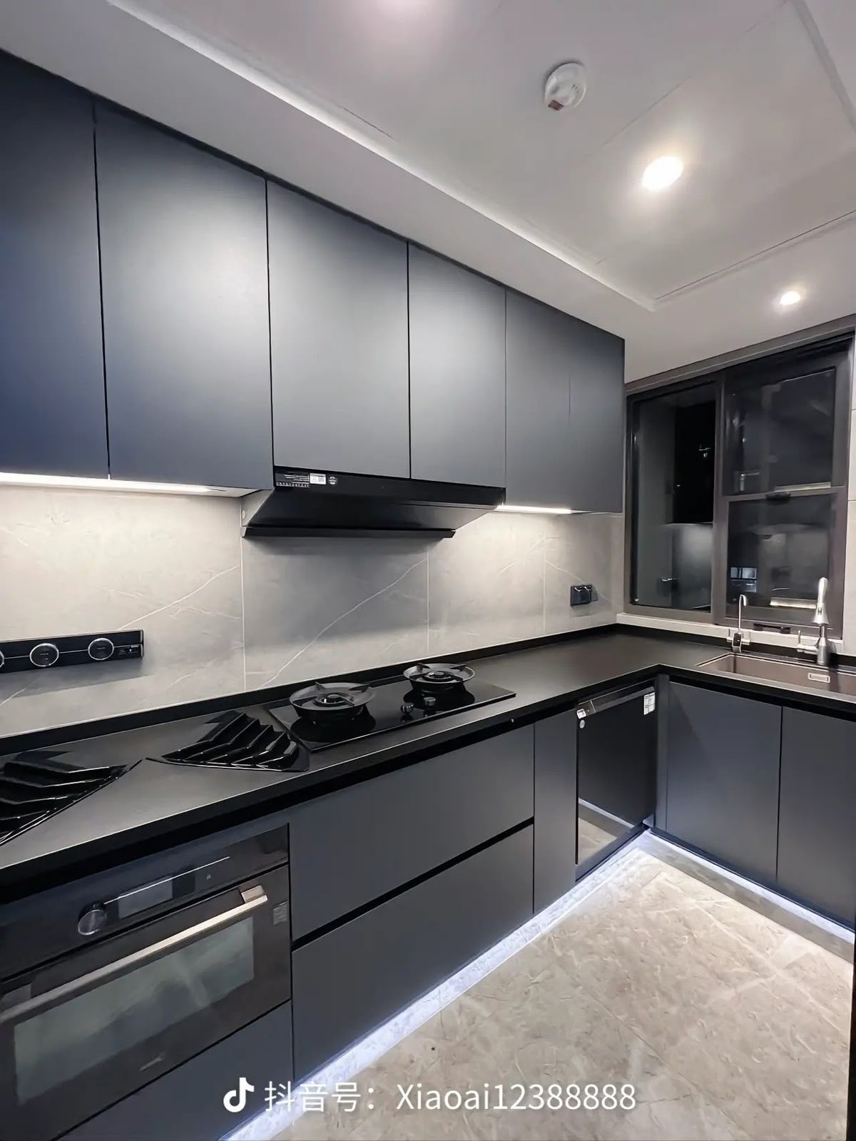 Navy blue flat door cabinets offer a modern and minimal design with a bold and refined color tone. The flat door style creates a smooth and seamless surface, while the navy blue finish adds depth and strong visual contrast. As a result, this design is often used in kitchens that aim for a distinctive and high-end appearance.